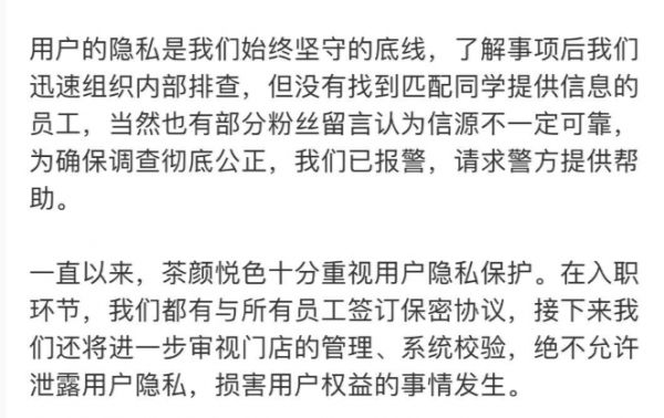 茶颜悦色针对此次信息泄漏质疑的回应
