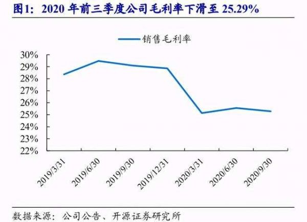 值得注意的是,在营收和净利润都欣欣向荣的情况下,美的毛利率出现小幅下滑,2020年前三季度公司毛利率为25.29%,较上年同期下滑3.8%,处于近年来较低水平,Q3毛利率同比下滑3.4%。