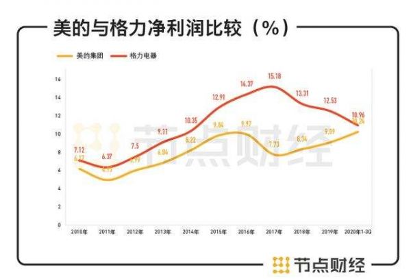 一直以来,格力都以高盈利著称,如下图所示,其净利润率均在美的之上,尤其是在2015-2017年间,二者的差距进一步拉大。