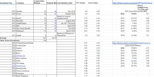 将这样的回报倍数与公开市场投资的回报倍数相比较蛮有意思。如果将它们拿来与SPY或者QQQ对比,那就更有意思了。如果我将钱投向SPY或者QQQ而不是某家公司X,到底SPY或者QQQ能给我带来多少投资回报呢?
