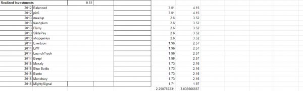 另外16家公司已经变现,综合倍数是0.61倍。这些企业包括:Moxxly、 meetup、Balanced、pic6 Studios、Flurry、Evertoon、MightySignal、Blue Bottle Coffee、LoveWithFood、LaunchTrack、Beepi、SlidePay、Freshplum、Shopgenius、Bento、Munchery。