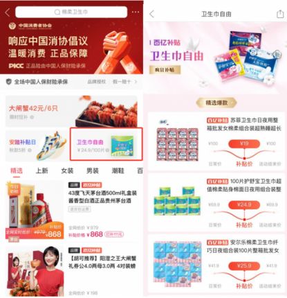 9月4日,拼多多百亿补贴频道上线了“卫生巾自由”补贴专区,经过平台官方补贴后,苏菲、护舒宝、高洁丝、七度空间、ABC等知名品牌的卫生巾每片单价能够降到0.3元以下。