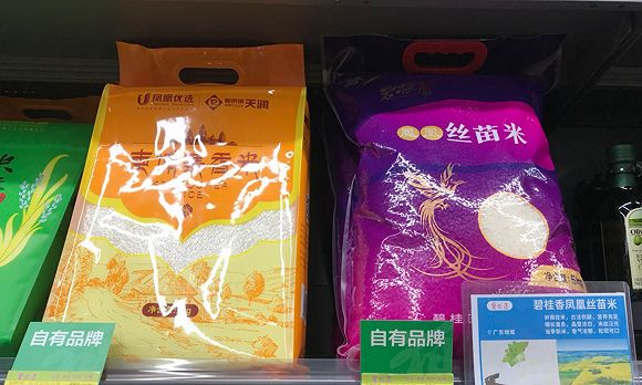 店内所售商品跟大多普通生活超市类似,但强调了价格相对亲民的自有品牌产品,包括“碧桂香”丝苗米、“碧优选”五粮情酒、“凤凰优选”洗洁精等,它们被放置在货架上最明显的位置。