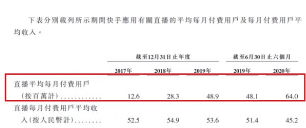 自2017年至2019年,快手直播业务的收入分别为79亿元、186亿元以及314亿元,2020年前6个月为173亿元。2020年上半年,快手直播平均每月付费用户达6400万,快手直播每月从付费用户获得的平均收入达45.2元。