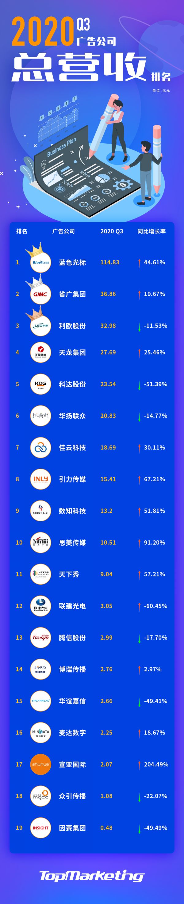 2) 总营收排名靠前的依然是蓝色光标、省广集团、利欧股份、天龙集团等几家集团型公司,与Q2几乎无差异,但总体营收数额有一定下滑。