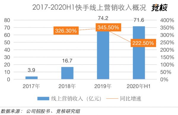 从招股书中可以看到,2017-2020年H1,快手线上营销收入分别为3.9亿元、16.7亿元、74.2亿元、71.6亿元,同比增速分别为326.3%、345.5%、222.5%,占总收入的比重分别为4.7%、8.2%和19%。