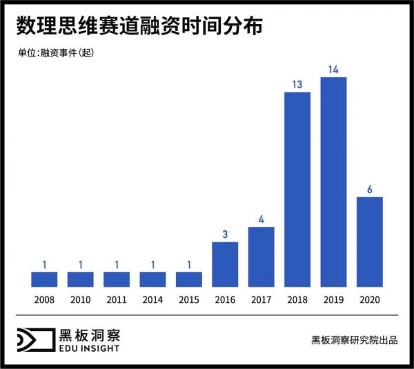 2015-2019年,行业内融资事件上升趋势明显,尤其在2018年,数理思维赛道在融资数量上实现了巨大提升。或许受疫情影响,今年数理思维赛道表现并不亮眼。2020年已过大半,仅发生6起融资事件,但8月至今的四次大动作,使得该赛道再次升温,如果想要保持住前两年的发展势头,数理思维还需要向外界展示更多可能性。