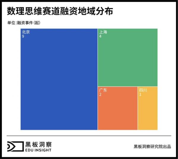 近几年,投资地域仅分布在北京、上海、广东和四川四个省市。其中北京占比高达56.25%。一线城市对于新教育赛道方向包容度更高,家长更愿意尝试。在北京、上海等城市,选择参加数理思维培训已经成为了部分“鸡娃”的标配。