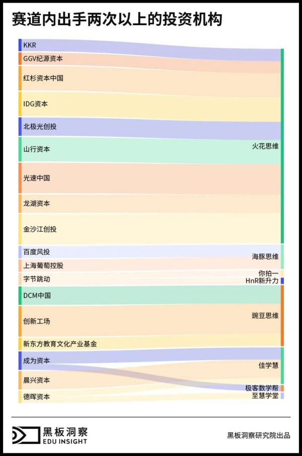 我们对数理思维赛道投资出手次数大于1次的机构进行了统计。不难发现,资本往往“钟情”于一家教培机构,连续参投。如火花思维、豌豆思维、海豚思维和佳学慧,均各自获得了资本长期青睐。其中光速中国、金沙江创投连续五次出手投资火花思维,创新工场连续五次出手投资豌豆思维。近两年想在教育行业深耕的字节跳动,也出手两次,开始涉足数理思维赛道。