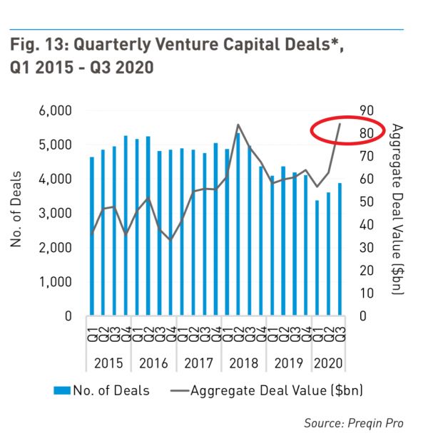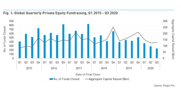 全球私募季度融资2015Q1-2020Q3,数据来源:Preqin Pro