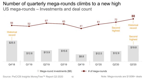 季度大额交易达到新高,数据来源:PwC/CB insights