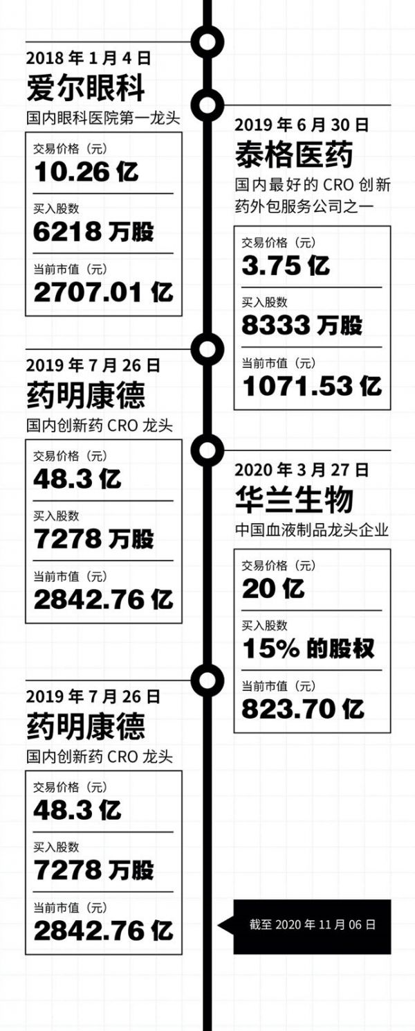 近两年高瓴资本在药明康德(693259.SH)、爱尔眼科(300015.SZ)、泰格医药(300347.SZ)等医药、健康类企业斥资约60亿的巨大手笔,无不显示出高瓴资本的深谋远虑和巨大野心。