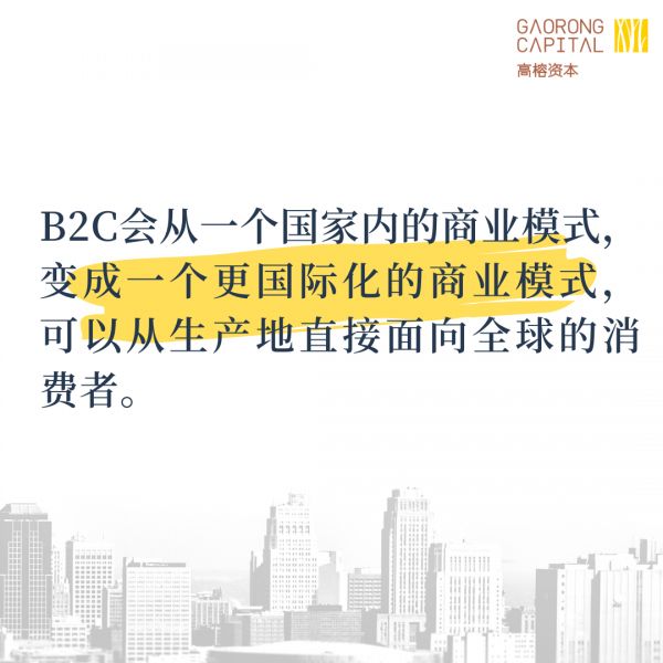 我们认为,B2C会从一个国家内的商业模式,变成一个更国际化的商业模式,可以从生产地直接面向全球的消费者。