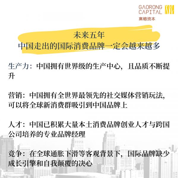 我们判断,中国品牌未来的发展会更加国际化,未来五年中国走出的国际消费品牌一定会越来越多。有几个大前提。