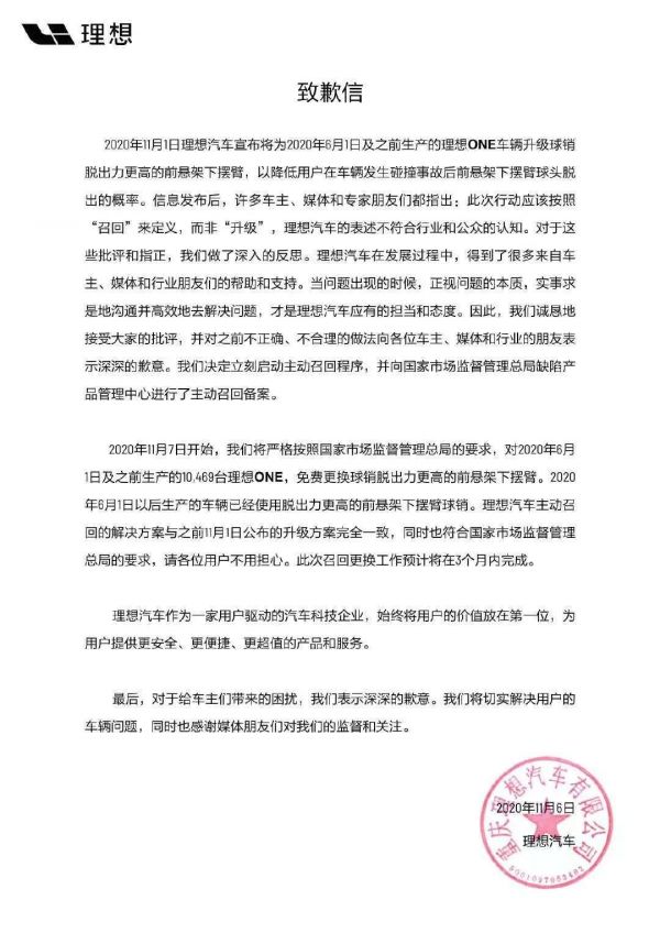 对于此次召回,理想汽车同日发布致歉信。在此之前,理想汽车被曝出多次断轴事故,但理想汽车一直将“召回”的处理方式称为“硬件升级”,引起业内人士的质疑。理想汽车在致歉信中称,“其表述不符合行业和公众认知。”