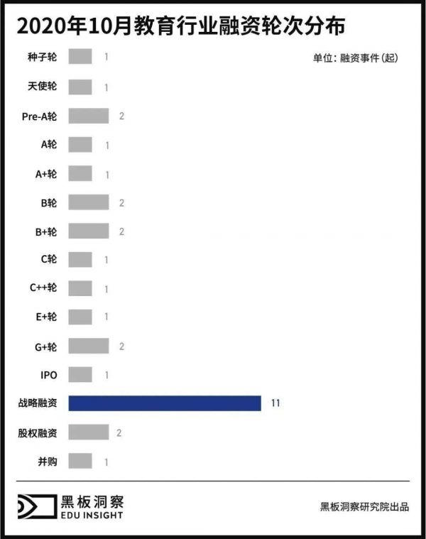 总体来看,2020年10月的融资情况呈“爆发式”增长,无论是事件数量还是金额体量都远超此前的9月。且10月的融资已跃居成为2020年融资最高峰,融资事件数量超过9月的22起,金额体量超过3月的71亿元。此外,融资轮次也呈现“多点开花”的态势,共有15种不同轮次的融资,从早期种子轮、天使轮到中期B轮、C轮,再到后期G+轮、并购甚至是IPO,均有涉及发生。由此可见,经过前两月的持续回暖,10月教育行业迎来了一次大爆发,热度大幅提高,赛道十分活跃。