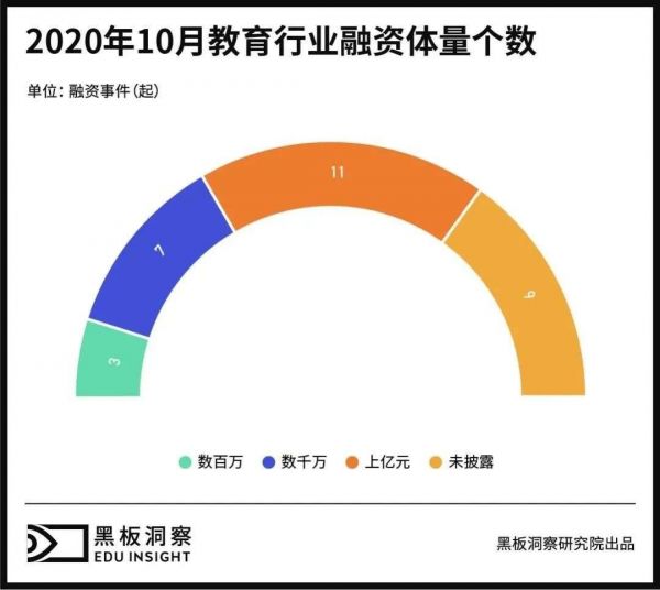 由于猿辅导的22亿美元融资,与9月相比,10月融资金额涨幅巨大,从9月的42.73亿元增长到175.6亿元,涨幅超过300%。其中,融资体量上亿元的事件发生次数最多,共有11起,占比为36.67%;千万级体量的共有7起,占比为23.33%;数百万体量的有3起。此外,有9起融资事件未披露具体金额。
