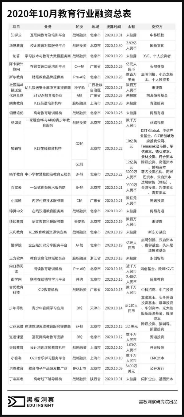10月教育行业融资报告:29家企业共融资175.6亿元,拔得头筹的是猿辅导