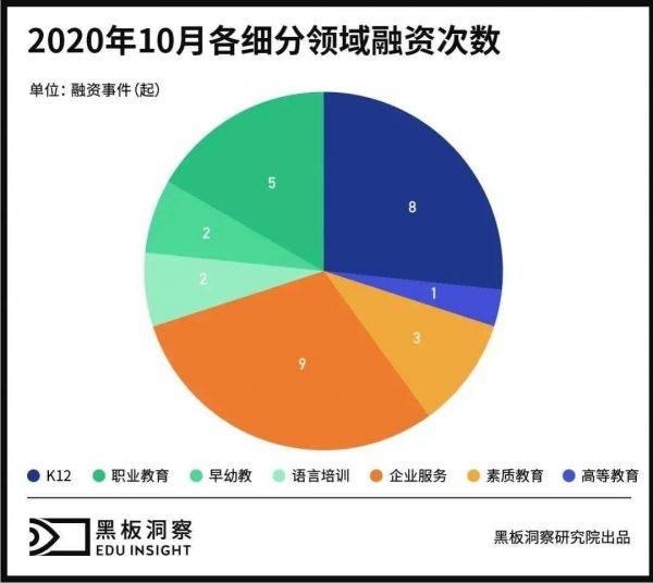 10月融资事件细分领域中,企业服务以9起的数量位居榜首,K12以8起的数量屈居第二,职业教育以5起的数量位列第三,素质教育以3起的数量排名第四。此外,早幼教、语言培训、高等教育领域也均有融资发生。