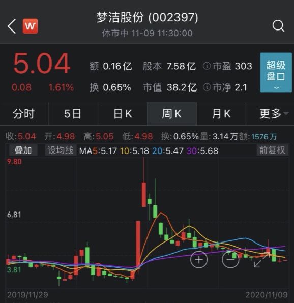 截至11月9日午间收盘,梦洁股份股价报5.04元/股,最新市值38.2亿元。