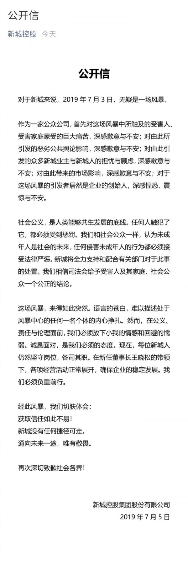 钛媒体快讯|7月5日消息:在经历了7月3日的风波后,今日下午,新城控股终于发布了公开信。
