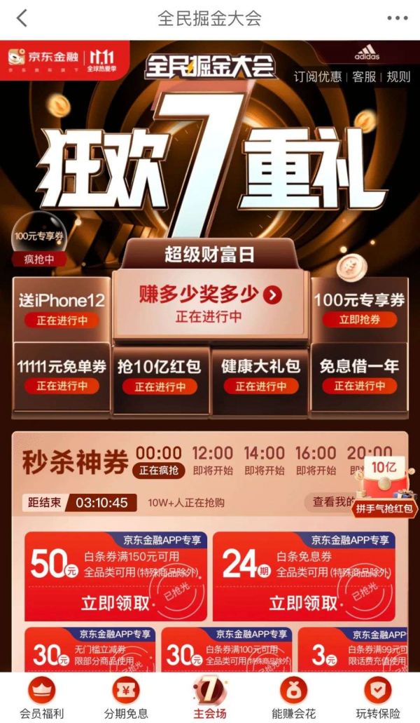 一送iphone12,二是健康大礼包:用户购买保险产品打折;三是基金收益赚多少奖多少,四是千万银行专项券:用户绑定指定银行信用卡,通过京东商城支付可满减;五是11111元免单券:用户通过打白条攒能量,打白条1元=1能量,根据能量值设置榜单,前1-5名可以获得11111元免单券,目前该项目已有115万用户参与;六是抢10亿红包;七是天天生金:也就是返金贴,用户报名成功且在经调解款成功,即可获得每笔借款每日实收息费10%的金贴,1金贴=1元,还可以参与抽全年免息券的活动,截至本月10号,累计参与人数已超134万人。
