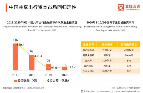 iiMedia Research发布的《2020年中国共享出行发展专题研究报告》提出,随着共享出行资本市场回归理性,资本对共享出行行业无止境投入的时代已经结束,近年行业融资事件及总金额均呈现下降状态。但网约车依旧是人们出行必不可少的方式之一,只是当资本不再疯狂,能够立足的企业开始露出锋芒。