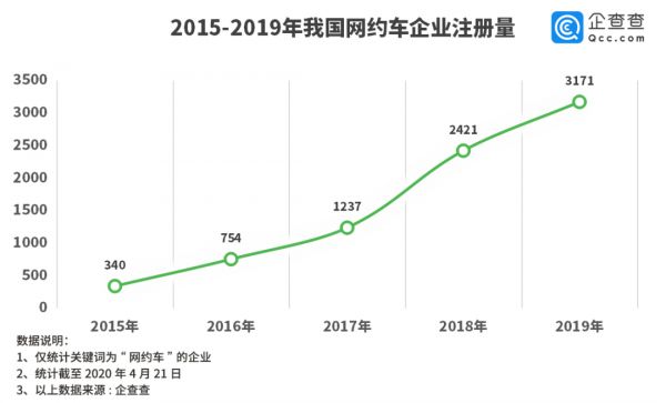 当第一波的网约车浪潮过后,格局基本被滴滴出行掌控,但这种情况下,网约车市场仍然暗流涌动。据企查查数据,2015年-2019年,网约车平台的注册数量直线递增,尤其近两年增长尤为明显,2018年网约车企业注册量为2421家,2019年增长到3171家。