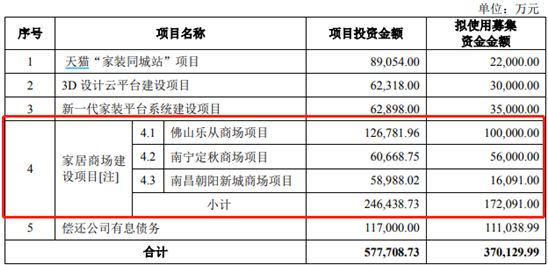 在此次红星美凯龙计划募集的37亿元资金中,有17.2亿元将用于家具商场的建设,占总募资的46.5%,有11.1元将被用于偿还公司的有息负债,占总募资的30%。而轻资产项目,包括天猫“家装同城站”、3D设计云平台等项目募资占比未超过30%。