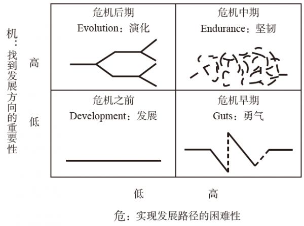 我们可以从“危”和“机”两个维度来分析危机下的边缘领导力。如图 3所示,机会代表着找到发展方向的重要性,危险代表着实现路径的困难性,它们都有高和低两种状况。该图即危机边缘领导力的EDGE模型。