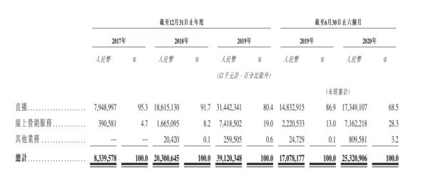 直播功能的顺利推进,让日后快手商业化道路变得顺畅。根据招股书显示,快手的直播虚拟礼物抽成在2017年、2018年及2019年分别为公司带来了79亿元人民币、186亿元人民币和314亿元人民币的收入,占总收入的95.3%、91.7%和80.4%。直播业务显然是快手的“现金牛”担当。