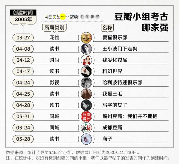 要了解「组学」,就要了解建组的初衷。曾经的豆瓣,还是文青的聚集地。根据对小组创建时间的统计,我们考古出历史最久远的十个小组。