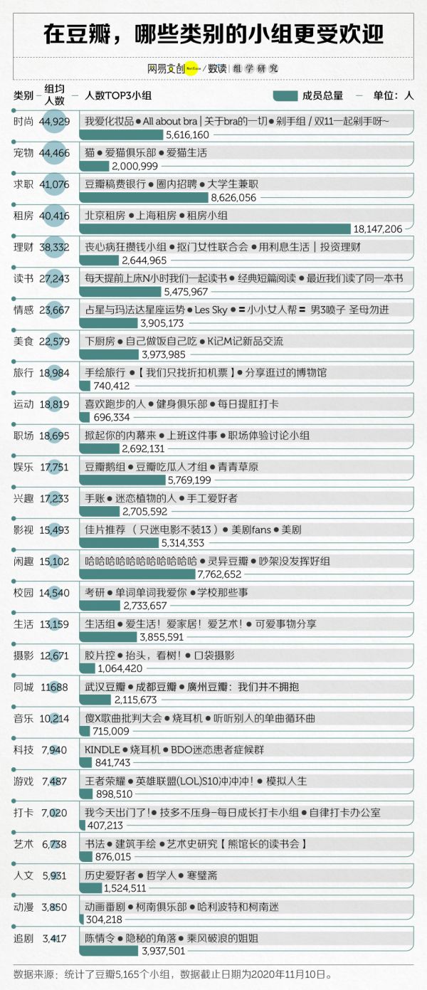 在豆瓣,有 27 个大类小组,每个大类下都有着百万级别的成员。