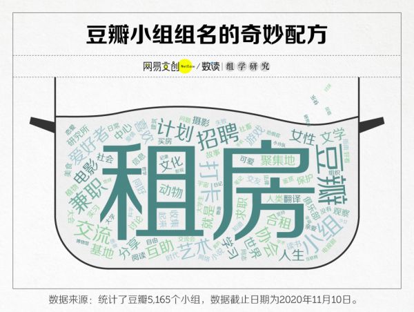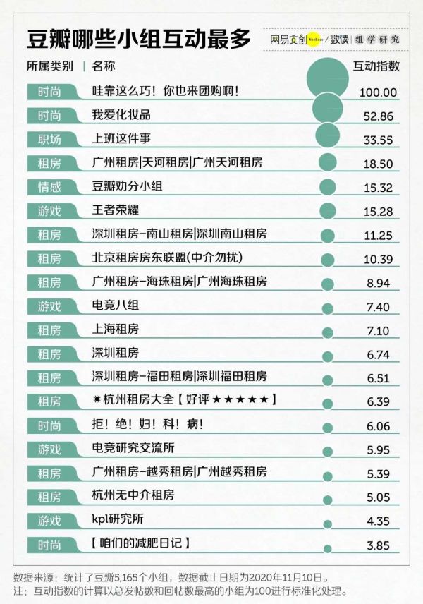 不过最受关注的,还是租房。在互动指数排行前 20 的小组名单中,有一半都和租房有关。大城市租房又贵又难,豆瓣成了他们新的房产中介。