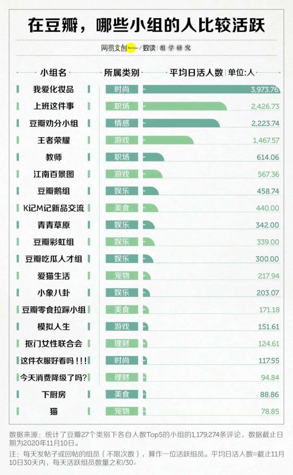 当然,大部分来豆瓣小组的人,并不想像沉默组那样一言不发。不要小瞧当代青年的活力,他们在豆瓣小组非常活跃,27 个类别下的热门小组在一个月内能产生几千万的帖子。