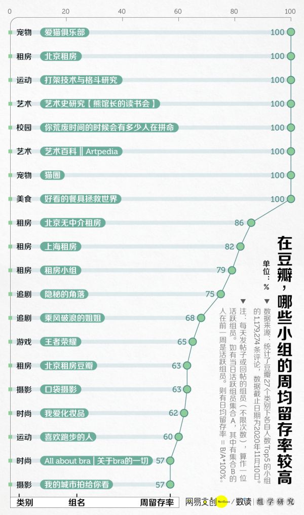 如果放松标准,以周为单位,有 8 个小组能达到 100% 的留存率。人们在这里分享美食和好看的餐具、撸猫,对外强身健体研究格斗,对内修艺术读百科,有趣的灵魂总能聚集在一起。