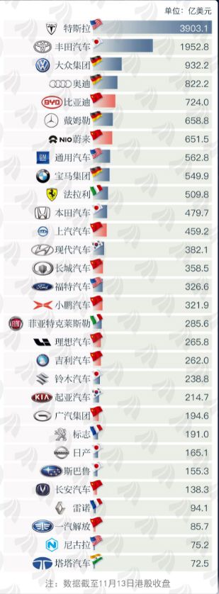 直到11月13日沽空机构香橼一纸报告“唱空”,各家造车新势力股价才从史高回落。但此时汽车行业的TOP30榜单早已有了新的排序。