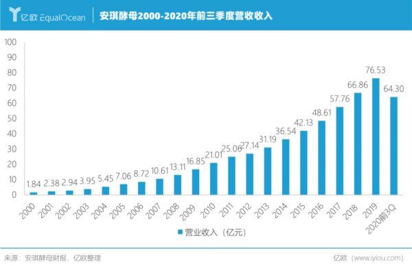 1999年,安琪酵母的营业收入为1.53亿元,2019年,这个数字为76.53亿元,增长了约49倍,年均复合增长率为21.61%。
