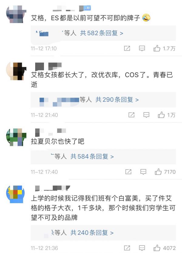 清仓大甩卖?消息一出,网友迅速炸开了锅。“一波回忆杀!上学的时候我记得我们班有个白富美,买了件艾格的格子大衣,一千多块,那时是我们穷学生可望不可及的品牌,因为款式实在很好,颜色也漂亮。”一位网友在微博这样写道,随后引发大量跟帖。