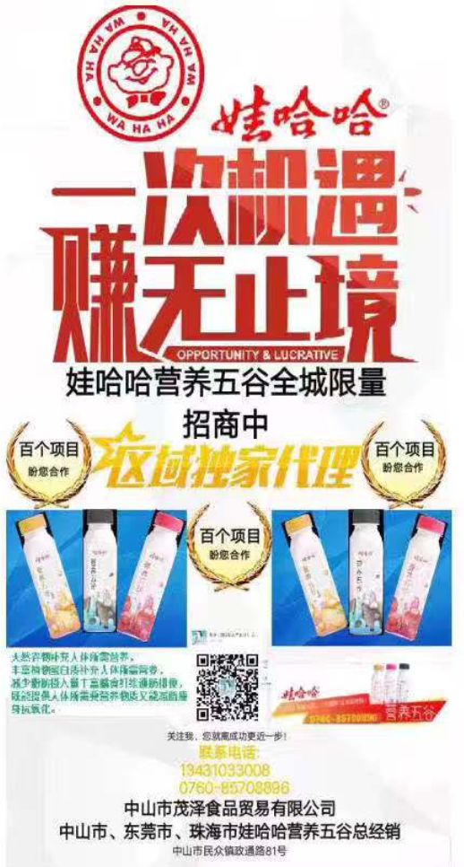 娃哈哈营养五谷的招商资料中,更有这般陈述——首次开放产品自循环娃哈哈联运体零门槛加入体验代理合作模式。这听起来既高大上又有“靠山”,且机会满满的说辞,小白们都会心痒吧?
