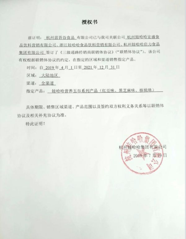 一份文件显示,杭州吾谷与杭州娃哈哈宏盛食品饮料有限公司、浙江娃哈哈食品饮料营销公司、杭州娃哈哈启力食品集团有限公司签订了《三级通路经销商联销体协议》。该公司有权根据联销体协议的约定,在约定区域和渠道销售指定产品。