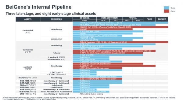 该公司目前拥有两种已经获批上市的抗癌新药——zanubrutinib(BTK抑制剂,又称百悦泽)和tislelizumab(PD-1抗体,又称百泽安),其中zanubrutinib是第一款完全由中国企业自主研发、在FDA获准上市的抗癌新药,也是中国首个上市的国产BTK抑制剂。