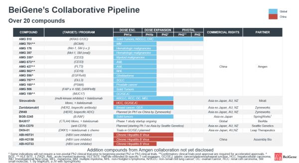 除自研项目外,「百济神州」还在去年11月与全球生物制药巨头安进达成全球肿瘤战略合作关系。后者以约27亿美元购入20.5%的「百济神州」股份,而「百济神州」获得了安进旗下3款药物在中国内地的开发和商业化权利,以及将与安进在全球共同开发20款后者管线内抗肿瘤药物。