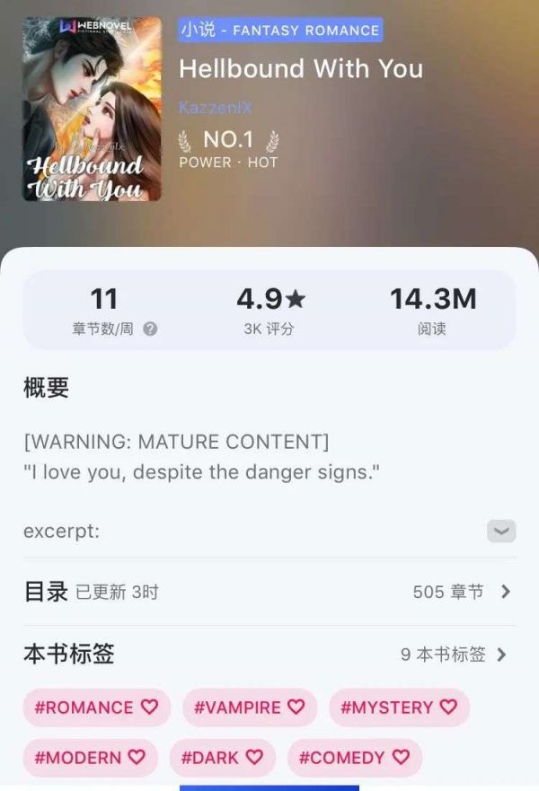 在首届“上海国际网络文学周”活动中,菲律宾作者Kazzenlx的小说《Hellbound With You》,荣获了Webnovel“最受欢迎的女性向原创作品”奖项。这部作品的读者评分高达4.9(满分5),拥有近300万的总订阅数。事实上,正是《许你光芒万丈好》,开启了Kazzenlx的创作之路。她本是囧囧有妖的粉丝,2019年1月4日,她成为了起点国际的网文作者。