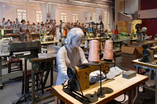 2020年6月24日,广东省东莞市虎门镇太平手袋厂陈列馆复原的当年生产车间设备和劳动场景。图:新华社