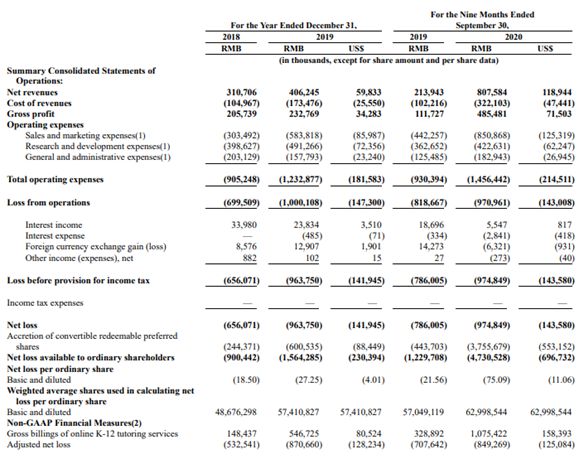 此次公开的招股书显示,一起教育科技在2018年和2019年,以及2020年前9个月,营收分别为3.1亿元、4.06亿元、8.08亿元,净亏损分别为6.561亿元、9.638亿元和9.748亿元。