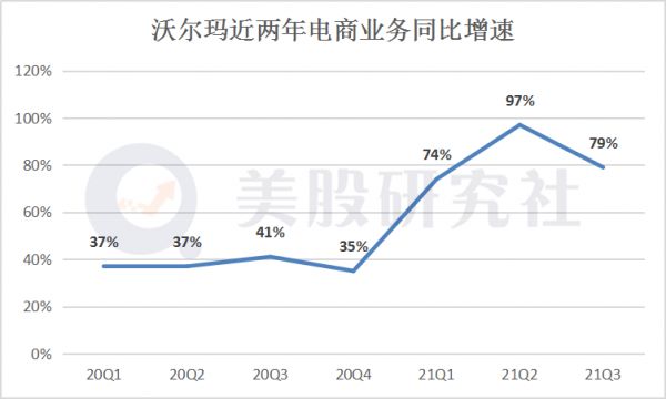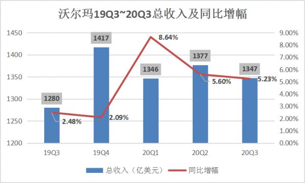 财报显示:沃尔玛本季度实现营收1347.08亿美元,同比增长5.2%,其中美国同店销售额增长6.4%,美国电子商务销售额增长79%。