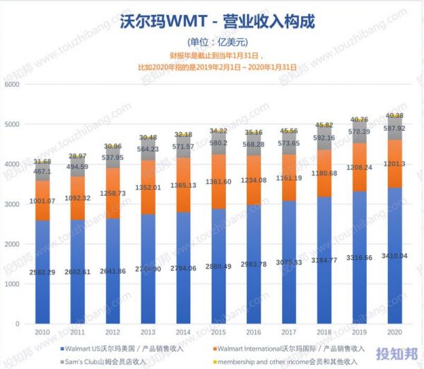 沃尔玛的营收来源分成了四个部分,分别是沃尔玛美国、沃尔玛国际、山姆会员店及会员和其他收入,其中沃尔玛美国的营收一直占据沃尔玛总体营收的主导地位,与这沃尔玛的发展战与营收增长有莫大的干系。