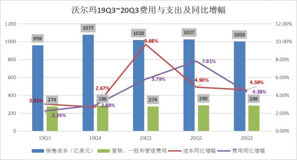 财报数据显示,沃尔玛本季度净利润为51.35亿美元,同比增长56.2%;销售成本为1003亿美元,同比增长4.59%,营销、一般和管理费用为286亿美元,同比增长4.38%。