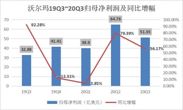 虽然成本较上一季度得到了控制,但净利润较上一季度却出现了下滑,这是由于受特殊因素影响,很多消费者选择购买大量杂货放在食品储藏室内,以避免多次去商店和其他人接触,受此趋势影响沃尔玛在第二季度的线下门店及电商销售量都得到了激增,导致在第三季度人们的消费需求降低,营收增速放缓,净利润增速也放缓。